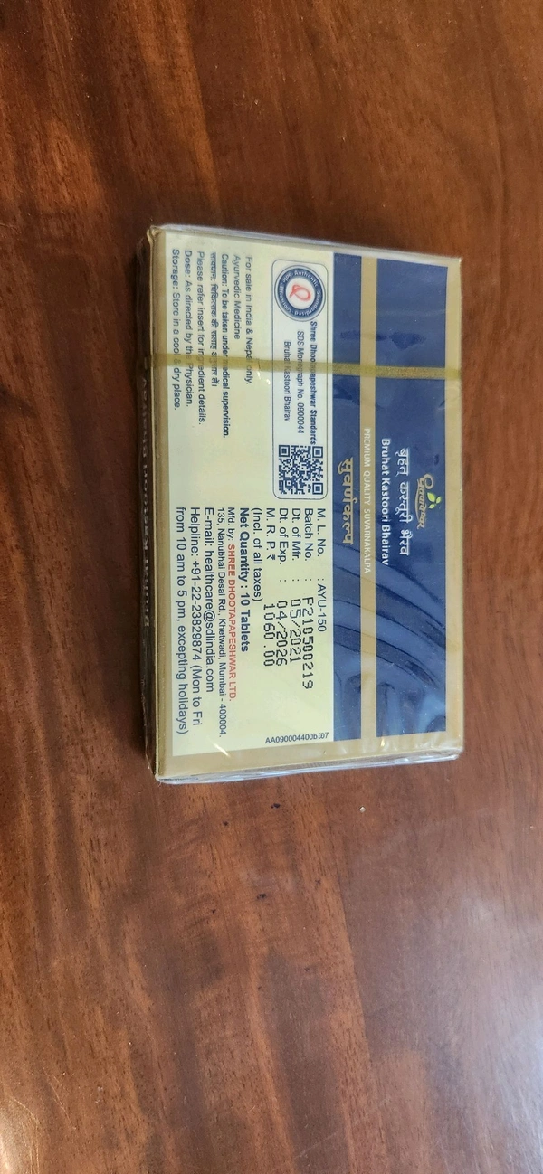 Dhootapapeshwar's Brihat Kasturi Bhairav is an Ayurvedic formulation intended to support overall health, particularly by addressing cardiovascular issues, relieving symptoms of fever, and balancing the Kapha and Pitta doshas. It functions as a dietary supplement and Rasayana (rejuvenative), thought to strengthen the heart and immune system, and may help with conditions like chronic fever, inflammation, and digestive discomfort.